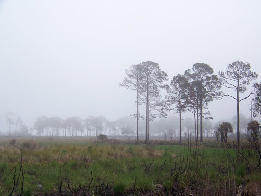The above picture shows the ghost forest. It was until fairly recently, a pine forest. One of our hurricanes pushed a wall of bay water through the dike system and all the way up to these trees. Apparently, pine trees don't deal with salt intrusion very well and this has become a large stand of mostly dead trees. The gloom of the fog was apropos.