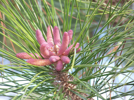This time of year, the pine trees are showing off their male cones that contain the pollen. The slightest breeze will fill the air with the yellowish-green pollen dust, coating everything and, hopefully, fertilizing the female cone that takes over a year to develop.