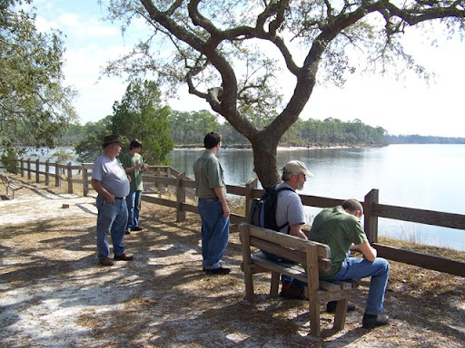 We spent most of the day at the Stone Age and Primitive Art Festival at the Ochlockonee River State Park, about an hour south of here. We took B's boy scouts to the event. Many of the exhibitors travel together to different events such as this. They are demonstrating flint-knapping, which is the art of chipping stone into tools. There were other craftsmen with baskets, pottery, carved wood, atlatls, as well as, archeologists from the State there. The boys got a chance to throw the atlatls and learned it is not as easy as it looks. The styles of atlatls ranged from very primitive to fairly high-tech. Atlatls have been used universally to propel spears and we were told they pre-date the bow and arrow. The spears run from about 5 to 7 feet; the lengths are used for different purposes. A publication stated: Acting as an extra segment of the human arm, the atlatl generates forces ten times greater than the unaided human arm. There is a physics lesson from prehistoric man!