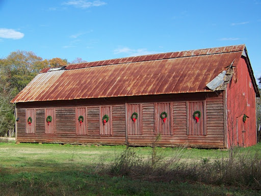In the days when tobacco was a main cash crop (along with cotton), barns were used for curing the leaves. Fires were built to heat the inside of the barn; later it was a gas burner. The vertical panels (where the wreaths are) served as vents to control the temperature. They opened out at the bottom, held in place by a stick. They also let light in the barn, which generally had no electricity.The floors were sand. The cedar shake roof of this barn had been replaced by tin, as evidenced in the right corner. The tobacco leaves were hung on sticks up in the rows of rafters to dry until papery and golden, which took about a month. This was hot work done in the middle of the summer. The sun tobacco is for cigarettes and the shade is for cigar wrappers. The cured tobacco was taken down, graded and bundled for auction. Different regions of the country grew different varieties for different purposes and the curing methods also varied. Often the people who worked in the Gadsden County, Florida and south Georgia fields and barns went to Connecticut to work there also.