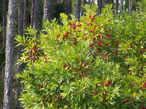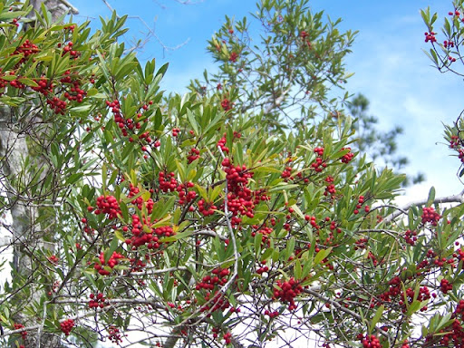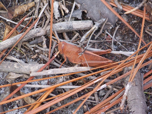 Directed by the Great Florida Birding Trail guide, we found the High Bluff Coastal Hiking Trail within Tate's Hell. The trail brochure at the kiosk said that the trail was completely orange blazed. Ain't necessarily so. The blaze markers lasted only a few yards down the trail and then, we were on our own. Bears are frequently seen in this area and we were on the lookout for any signs of them. Did we mention we were the only vehicle in the parking lot? The trail got more and more narrow and the scrub palmetto and blueberry bushes got higher until the trail was no more than two boots wide and we decided that we had seen enough of this trail. We stopped at a picnic table and rested a while and I took the picture over my head.