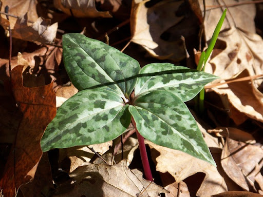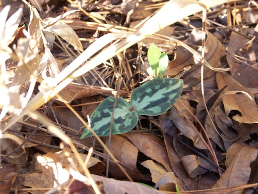 We went to Chattahoochee in western Gadsden County in search of trilliums. We found them ---and much more. Trilliums are only found in Florida in some places in the panhandle, though they are common in more northern states. Trilliums have three leaves, hence the name. They are among the first plants that arise in the woods in spring. There were dozens and dozens of them up today. In a few weeks, a flower will appear in the center of the three bracts. This picture was made last February.