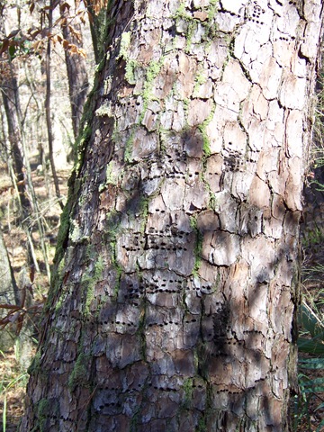 This pine shows where a sapsucker, a kind of woodpecker, has been at work.