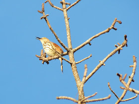 While we work in our vegetable garden we are often serenaded by this brown thrasher. Many times times he remains unseen in the top of a very tall, very dead pine. But one evening, I had seen him flying with a mate, or more likely, a prospective mate since he continues to sing. She flew off, but I watched as he landed in his usual tree and the sun was just low enough for me to be able to see him. Thrashers are cousins to mockingbirds with similar voices.